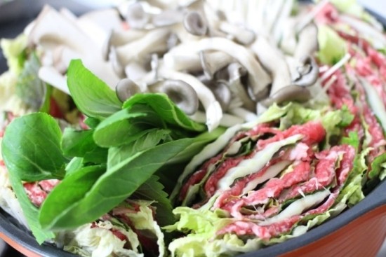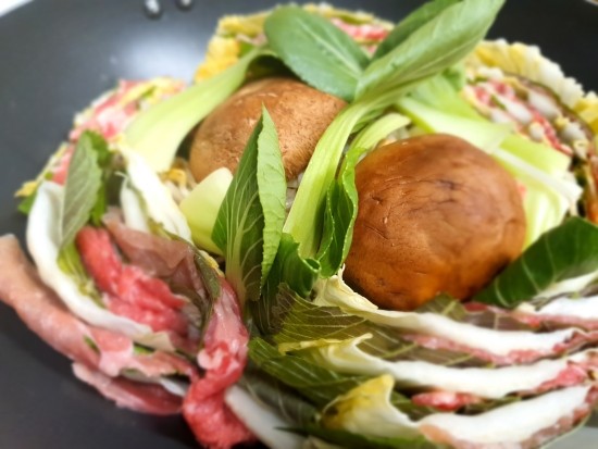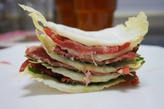 잘 쌓은 야채와 고기들 잘라주면~~ 여런 단면이~