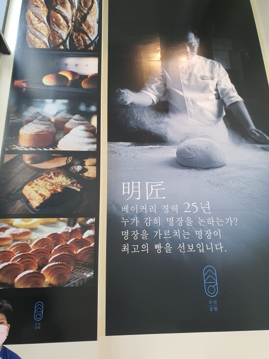 우리가족이 자리잡은 한켠엔 벽면에 베이커리 25년 장인의 브로마이드가~