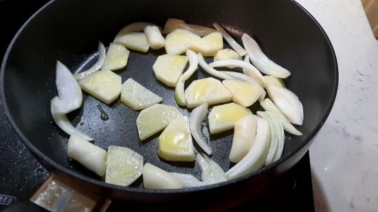팬에 양파와 오늘은 제철에 맛나는 감자까지 넣어서
