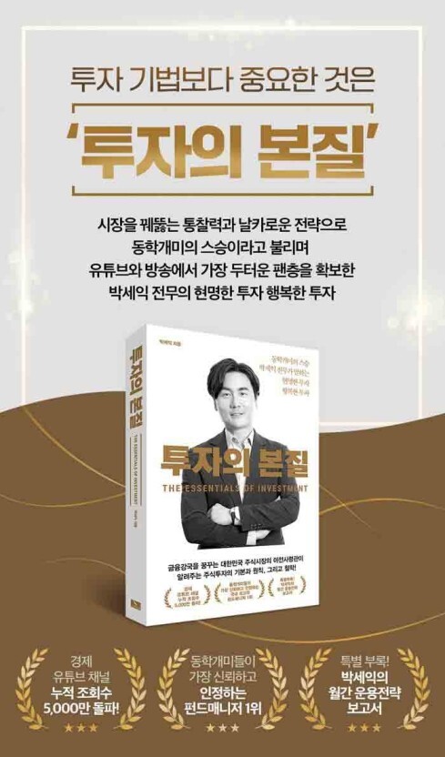 시장을 꿰뚫는 통찰력과 날카로운 전략으로 동학개미의 스승이라고 불리며 유튜브와 방송에서 가장 두터운 팬층을 확보한 박세익 전무의 현명한 투자 행복한 투자! 박세익 전무는 코로나19로 인해 한 치 앞을 내다보기 힘들었던 혼란의 시기에 유튜브 채널과 미디어를 통해 코스피 3,000 돌파를 가장 먼저 예언하며 주식투자를 적극 권했던 강세론자다. 시장을 꿰뚫는 통찰력과 날카로운 전략으로 ‘동학개미의 스승’ ‘여의도의 현인’ ‘갓세익’이라고 불리며 아이돌 팬클럽 못지않은 두터운 팬층을 보유하고 있다. 그런 박세익 전무가 개인투자자들을 위해 27년간 치열한 전투를 치르며 쌓아온 소중한 노하우를 『투자의 본질』 책 한 권에 모두 담았다. 이 책에서는 주식투자의 기본과 원칙, 철학뿐만 아니라 시장 조정 가능성과 그 이유, 그리고 적절한 대응 전략을 내보이며, 투자자들이 시장을 바라보는 정확한 관점과 이정표를 제시하여 어떤 시장에서도 이길 수 있는 투자 전략을 알려준다. 증권방송이나 여러 책에서 소개되는 매매기법을 적용하면 돈을 버는 듯하나 대부분은 시간이 지날수록 돈을 잃고 주식에 실패한다. 그렇다면 성공한 투자자와 실패한 투자자의 차이는 무엇일까? 답은 하나다. 주식의 본질을 제대로 파악했느냐 안 했느냐의 차이다. 박세익 전무는 현명한 투자자란 시장을 이기는 ‘종목’이 아니라 시장을 이기는 ‘투자의 본질’을 공부한다고 말한다. 변동성이 심한 한국 시장에서 잃지 않는 투자를 하기 위해서는 주식시장이 갖는 변동성의 원인과 그 대응 전략을 반드시 갖고 있어야 한다. 『투자의 본질』을 통해 시장의 흐름을 미리 짚어내는 방법과 그 대응 전략에 대해 배워보자!