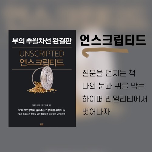 변화를 원하지만 변화하지 못하는 당신을 움직이게 할 이야기! 30대에 자수성가한 백만장자 사업가이며 발명가인 엠제이 드마코. 그가 젊어서 부자가 되는 길을 공개하며 ‘추월차선’이라는 말을 일반명사로 만들 만큼 큰 반향을 불러일으킨 《부의 추월차선》의 완결판 『언스크립티드』. 아직 추월차선에 진입하지 못한 이들을 위해 펴낸 이 책에서 저자는 풍요, 자유, 행복을 일깨울 청사진을 제공하고 극소수만이 꿈꾸는 인생을 자유롭게 만끽할 수 있는 기회를 제공한다. 1부에서는 저자는 우리가 성인이 된 이래로 지금까지 우리를 괴롭혀 온 문제를 드러낸다. 2부에서는 21세기 최대의 속임수를 폭로하고 그 속임수가 어떻게 우리의 꿈을 도적질해 왔는지 정확하고 정밀하게 진단한다. 3부에서는 게임을 지배하는 문화적 원칙들로부터 마음이 해방되기만 하면 무엇이 가능해지는지를 선명하게 보여준다. 4부에서는 각본 없는 기업가정신의 명확한 청사진, 창업에 대한 상세한 틀을 제시하고, 5부에서는 현존하는 최고의 소득 시스템에 대해서 설명한다. 이를 통해 돈의 노예로 일하지 않는 법을 배우고, 그것을 어디서 찾고 어떻게 당장 시작할 수 있을지를 알 수 있게 해준다. 이처럼 자유를 담보로 한 현대판 노예의 삶을 벗어나 젊어서 부와 자유를 누리기 위해 지켜야 할 법칙과 강령들을 조목조목 짚어주는 이 책은 의미 있는 삶을 살고자 하는 이들에게 동기부여가 되어준다.