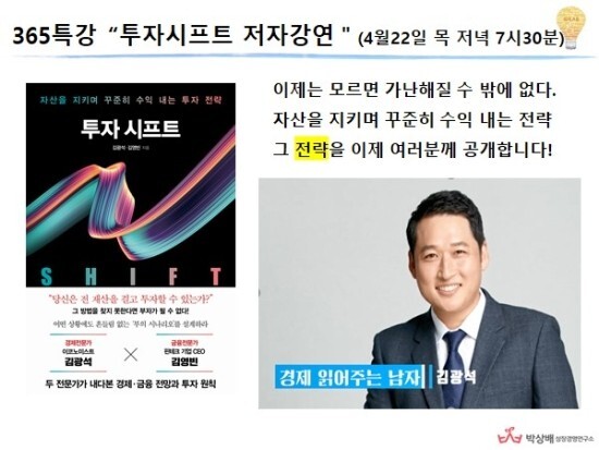 《투자 시프트》에서는 유튜브 ‘경제 읽어주는 남자’로 대중에게 친숙한 이코노미스트 김광석과 국내 1위 로보어드바이저 기업 파운트 CEO 김영빈이 함께 경제 전망을 진단하고 금융 패러다임 전환기 투자 전략을 제시한다. 이제는 돈이 돈을 벌게 하는 시스템적인 전략이 필요한 시기다. 그러기 위해서 가장 먼저 할 일은 지금 우리가 맞닥뜨린 경제 흐름과 금융 패러다임을 이해하고, 이를 바탕으로 지금까지의 투자 방식을 점검해야 한다. 두 저자가 말하는 어떠한 상황에도 흔들림 없는 ‘부의 시나리오’를 설계하는 방법을 만나보자