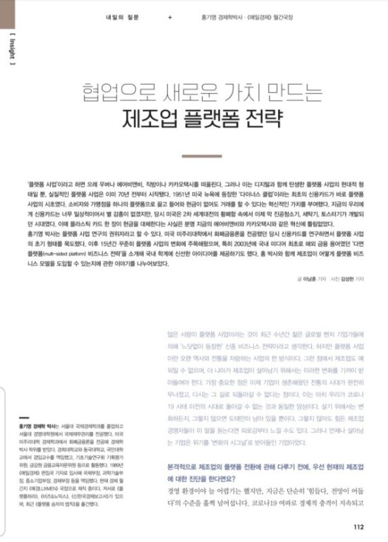 코로나19가 세계를 휩쓸면서 기존 패러다임이 무너졌다. 내수, 수출, 고용 등 경제 전반에 퍼펙트 스톰이 닥쳤다. 소비와 공급 양면에서 충격이 동시에 발생했다. 생산과 소비 패턴에 큰 영향을 미쳤고, 국민 경제의 모든 것을 바꿔놓고 말았다. 포스트 코로나 시대, 비즈니스 모델은 어떻게 바뀔 것인가? 세 가지 트렌드가 세계 경제를 지배할 것이다. 첫째, 디지털 전환 현상이다. 전자상거래, 재택근무, 온라인 강의 등 언택트(비접촉) 기술이 꽃을 피우고 있다. 둘째, 제조업 비즈니스 모델도 파이프라인 모델에서 플랫폼 모델로 바뀌고 있다. ‘생산자→조달→조립→유통→판매→소비자’ 일방향적 구조에서 ‘생산자↔플랫폼↔소비자’ 순환될 수 있는 생태계를 만들고 있는 것이다. 코로나를 계기로 온라인 소비가 늘어나면서 디지털 장터, 플랫폼이 더욱 주목받게 될 것이다. 셋째, 새로운 산업에서 독과점 현상이 강화된다. 기민하게 움직이는 플랫폼 기업이 시장을 만들고 주도권을 장악한다. 웨어러블 기기를 확대한 애플, 윈도우를 버리고 클라우드에 집중한 MS의 혁신이 그 예다.