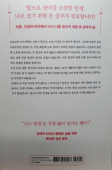 저자는 위로는 부모를, 아래로는 자녀를 돌봐야 하는 이중 부담에, 언제 닥칠지 모르는 은퇴로 불안에 떨며 지내는 40대 이후 인생 2막 재테크에 있어 가장 중요한 것은 안정적인 현금흐름을 만드는 것이라고 이야기하며, 평범한 중년 직장인이 택할 수 있는 가장 안정적이고 확실한 길로 ‘행복 재테크 5단계 로드맵’을 제시한다. 시니어 크리에이터로 성공하는 법과 더불어 인생 2막의 돈 버는 무기가 되어줄 대인관계법 및 독서법, 고객을 찾아오게 만드는 SNS마케팅 방법 등을 통해 노후 대비를 할 수 있도록 도와준다.