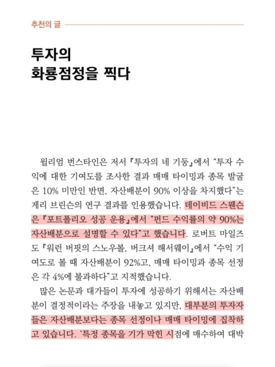돈 버는 사람들은 이렇게 주식을 삽니다! 따라만 하면 수익이 나는 대가들의 검증된 투자 시스템 주식, 코인, 부동산 무엇에 투자했든 “그때 살걸!” 혹은 “그때 팔걸!”이라고 생각해 보지 않은 투자자는 한 명도 없을 것입니다. 그런데 저 말은 결국 무엇을 의미할까요? 우리는 미래를 예측할 수 없다는 것입니다. 지나고 보면 모든 게 쉬워 보입니다. 하지만 당시에는 한 치 앞을 알 수 없습니다. 코로나19가 이렇듯 우리의 일상을 위협하게 될 줄 누가 알았을까요? 집값이 단기간에 이토록 갑작스레 폭등할 줄 누가 알았을까요? 한두 번은 미래 예측이 맞을지도 모릅니다. 하지만 신이 아닌 이상, 모든 미래를 100% 맞추는 사람은 있을 수 없습니다. 그래서 우리에게는 경제 상황이 어떻게 변해도 안전하게 수익을 낼 수 있는 투자전략이 필요합니다. 자산배분과 마켓 타이밍 투자가 그것입니다. 자산배분이란 여러 자산군에 자금을 나누어 투자하는 것을 말합니다. 포트폴리오를 ‘장기적으로 우상향하는 자산’으로 나누어 구성하면 경제 상황이 바뀌어도 오르는 자산의 수익이 떨어지는 자산의 손실을 커버하고도 남아 안정적인 수익률을 내게 됩니다. 또한 마켓 타이밍 전략을 이용하면 떨어질 자산을 피하고 오를 자산에 투자할 확률을 높일 수 있습니다. 이 전략 또한 자산배분의 일종으로 볼 수 있어, ‘동적자산배분’이라고 부르기도 합니다. 부자 중에 자산배분 포트폴리오를 활용하지 않고 투자하는 사람은 없습니다. 이 책의 저자는 부자, 즉 투자의 대가들이 개발하고 사용한 전략들을 연구하고 정리했습니다. 그리고 그 전략들을 자기 것으로 만들어 꾸준히 실천했습니다. 그 결과 경제적 자유를 얻어 만 38세에 ‘신의 직장’이라고 불리는 회사를 과감히 퇴사하고, 파이어(FIRE, 이른 은퇴)에 성공했습니다. 현재 그는 전업투자자이자 구독자 8만 명인 「할 수 있다! 알고 투자」 유튜브 채널을 운영하는 유튜버, 투자 관련 서적을 집필하는 작가, 온·오프라인 투자 강의를 하는 강사로 살면서 ‘하고 싶은 일만 하면서 돈까지 버는’ 꿈 같은 인생을 살고 있습니다. 그는 자신이 해왔던 것처럼, 평범한 직장인도 적은 시간을 들여 쉽게 따라 하면서 경제적 자유를 이룰 수 있는 투자전략들을 소개하기 위해 이 책을 썼습니다. 이 책에는 올웨더 포트폴리오 포함 5가지의 자산배분 전략, 듀얼 모멘텀 전략 포함 12가지의 마켓 타이밍 전략, 강환국이 전략 포함 6가지의 혼합 전략이 있습니다. 저자는 이 전략들이 어떻게 생겨났는지부터 어떻게 활용해야 하는지까지 누구나 이해할 수 있도록 쉽고 재미있게 알려주고 있습니다.