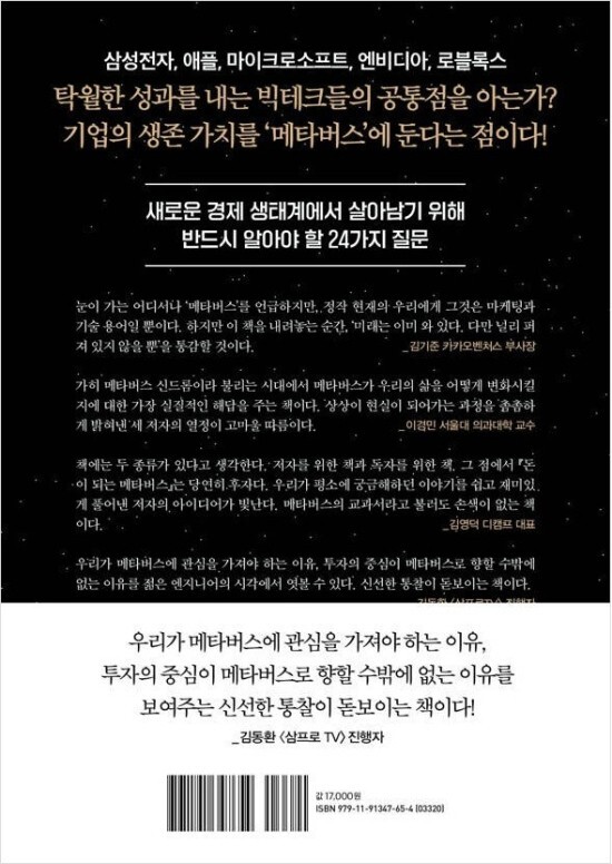 바로 여기에 이 책 『돈이 되는 메타버스』의 효용이 있다. 현대전자와 삼성종합기술원, 삼성전자 등을 두루 거치며 10여 년간 미래 기술을 연구해온 최원희 박사는 메타버스라는 새로운 산업 트렌드를 이해하기 위해서는 관련 산업들의 발전을 살펴보는 일이 필수적이라고 이야기한다. 미래 경제 생태계를 이끌 신기술을 분석하고 투자의 기회를 발견하도록 돕는 비디씨랩스(주)의 ‘메타버스 투자 프로젝트’에 참여해 이 책의 토대를 기획한 그녀는 숙련된 엔지니어의 시선을 통해 현재 미래 기술의 위치와 한계, 가능성을 면밀하게 살펴보는 것은 물론이고 우리의 업무 환경, 놀이 문화 더 나아가 소통의 방식까지 획기적으로 변화시킬 메타버스의 미래를 생생하게 그려낸다. 더불어 국내 최고의 빅테크 기업에서 일한 경험을 되살려 메타버스 시대를 이끌 미래 기술을 보유한 기업들의 최신 현황을 공개하고 투자에 대한 신중한 인사이트를 제시함으로써 메타버스 시대를 맞이할 독자들에게 가장 실리적이고 현실적인 조언을 아낌없이 전한다.