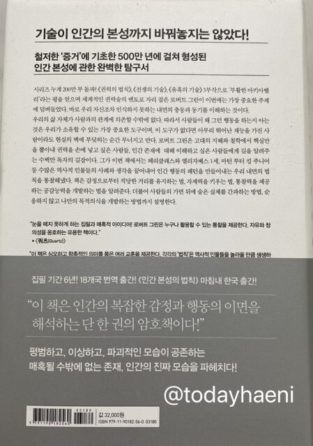 《권력의 법칙》의 저자 로버트 그린이 우리 안에 숨겨진 인간 본성에 관한 18가지 법칙을 통찰해내며 평범하고, 이상하고, 파괴적인 모습이 공존하는 매혹 될 수밖에 없는 존재, 인간의 진짜 모습을 파헤치는 『인간 본성의 법칙』. 우리는 자신의 행동이 대부분 의식적이고 의지에 따른 것이라고 생각하지만 실제로는 내면 깊숙한 곳에 위치한 여러 힘의 지배를 받는다. 우리 눈에 보이는 것은 내 생각과 기분 등 내면의 힘에 지배당한 결과물일 뿐이다.