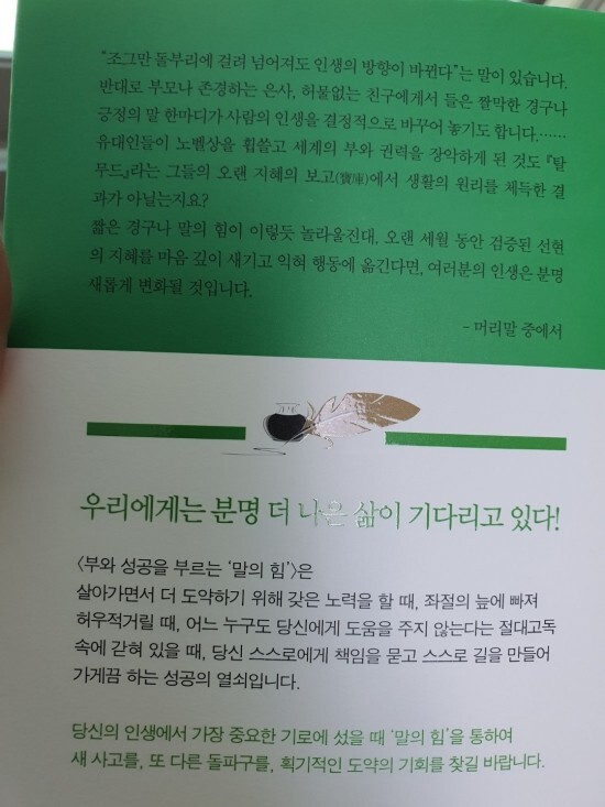 〈부와 성공을 부르는 말의 힘〉은 독자들을 색다른 통찰로 가득 찬 지혜의 세계로 안내한다. 때로는 잔잔한 숙고가, 때로는 반전의 묘미가 번뜩이는데, 평범한 한마디 속에 깃들인 그윽한 지혜의 맛이 우러난다.