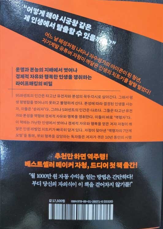 저자 역시 스무 살까지는 이런 쳇바퀴에 갇혀 있었기 때문에, 그 상황을 누구보다 잘 알았다. 자청의 첫 책 『역행자』에는 가난한 인생에서 벗어나 경제적 자유와 행복을 얻은 저자가 깨달은 인생 레벨업 치트키가 빼곡히 담겨 있다. 10대 때의 그는 외모, 돈, 공부, 그 어떤 것에서도 최하위였다. 그러던 스무 살 무렵, ‘인생에도 게임처럼 공략집이 있다’는 사실을 깨닫고 삶이 180도 바뀌기 시작한다. 200여 권의 책을 독파하며 얻은 인생의 치트키들을 활용해 창업에 연이어 성공한 것이다.