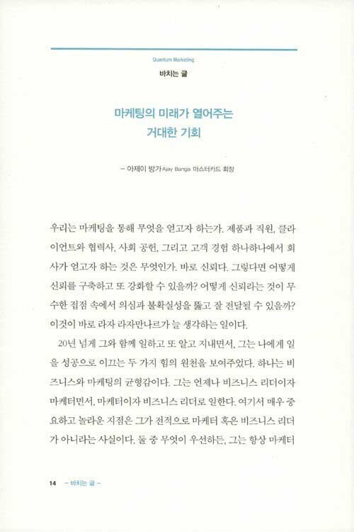 숨결까지 데이터가 되는 마켓 5.0 시대 비즈니스의 미래 글로벌 마케팅 거장의 날카로운 통찰과 대담한 제언 당신이 아침에 눈을 뜬다. 스마트 침대가 기상을 감지하고 클라우드에 정보를 전달한다. 이 장치들은 당신의 수면 상태가 어땠는지 알고 있다. 커넥티드 체중계에서 몸무게를 확인하면, 다소 갑작스러운 체중 감소에 울혈성 심부전 위험을 경고한다. 아침식사를 위해 커넥티드 냉장고에서 식재료를 꺼낸다. 삼성이 알아서 부족한 식료품을 주문하고 소비한 칼로리를 계산해줄 것이다. 자율주행 자동차에 올라타면 커피 한잔 마실 스타벅스 매장을 제안한다. 자율주행 자동차들과 GPS 위치추적기가 수집한 교통 데이터를 바탕으로 가장 적절하다고 판단된 곳이다. 결제에 신경 쓸 필요도 없다. 모든 처리는 뒤에서 다 이루어지니까. 숨결까지 데이터화하는 세상, 믿을 수 없을 정도로 방대한 데이터가 클라우드로 들어가고 있다. 기업들은 이를 수집하고 정리하고 실시간으로 분석하면서 엄청나게 강력하고 실행 가능한 인사이트를 얻을 수 있게 되었다. 제5의 패러다임 마켓 5.0 시대가 도래했다. 이제 비즈니스는 과거와 전혀 다른 수준에서 발생하는 데이터, 콘텐츠, 메시징, 자동화가 얽히고설킨 복잡한 미로를 뚫고 들어가 고객을 만나야 한다. 그런데 시장이 비약적으로 변화하고 있는 지금 이 시기에 왜 마케터들의 존재감은 줄어드는 것일까. 조사에 따르면 CEO의 80%가 마케팅팀에 대한 확신이 없다고 답했고, 73%는 마케팅팀 구성원들이 성장을 창출해낼 능력이 없다고 대답했다. 거대한 기술 혁신, 데이터 분석의 엄청난 도약, 모바일 환경 및 소셜미디어로 인해 발생하는 소비자 행동의 변화는 기존의 비즈니스 모델에 큰 충격을 주면서 전통적인 전략을 완전히 무너뜨리고 말았다. 마케팅 분야의 수습사원으로 시작해 여러 기업과 산업 부문, 국가에서 경험을 쌓고 세계적인 신용카드사 ‘마스터카드’의 마케팅 및 커뮤니케이션 최고책임자(CMO)로서 선도적인 마케팅을 이끌고 있는 라자 라자만나르는 마케팅 환경에서 발생하는 급속한 변화와 현재 우리가 처한 상황을 배경으로 모든 것을 다시 살펴보자고 말한다. 그리하여 제5의 패러다임에서 비약적인 성장을 이끌어갈 마케팅 전략을 ‘퀀텀 마케팅(Quantum Marketing)’이라 정의하고, 이 프런티어 전략을 통해 패러다임의 변화를 다루고 유리하게 활용하기 위한 마케팅 방법론을 재구성하고 프로그래밍할 것을 주문한다.