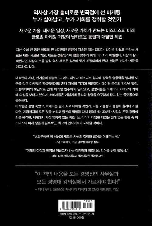 역사상 가장 흥미로운 변곡점에 선 마케팅 누가 살아남고, 누가 기회를 쟁취할 것인가 장면 #1. 2020년 4월, 미국의 힙합 가수 트래비스 스콧은 게임 ‘포트나이트’ 내에서 콘서트를 열었다. 전 세계에서 1230만 명이 몰려들었고, 수익은 기존 공연의 10배에 달했다. 또한 글로벌 시가총액 상위 10개 기업 중 다섯 곳(애플, 마이크로소프트, 아마존, 페이스북, 텐센트)이 메타버스 선점 경쟁에 나설 것을 선언했다. 장면 #2. 2021년 4월, 애플은 아이폰 운영체제(iOS)에 ‘앱 추적 투명성(ATT)’ 기능을 도입했다. 앱을 처음 실행할 때, 이용자의 활동 기록을 추적해도 될지를 묻고 승인을 받도록 한 것이다. 활동 기록 추적에 동의한 이들은 미국 아이폰 활성 이용자 250만 명 가운데 단 4%에 불과했다. 이처럼 사생활 노출을 꺼리는 소비자가 늘고 있는 상황에서 기업은 어떻게 타깃을 찾고 그들에게 광고를 노출할 것인가? 장면 #3. P&G의 커넥티드 칫솔은 사용자에게 양치질 방법, 칫솔이 닿지 않은 부위 등을 알려준다. 스마트폰에 연결된 이 칫솔이 사용자의 양치 습관에 따라 치약, 치실, 구강청결제를 주문해준다면? 이러한 접근 방식은 고객의 관성을 활용하고 선택을 자동화하며 소비를 강제한다. 그렇다면 여기서 마케터가 하는 역할은 대체 무엇이란 말인가? 인공지능, 가상현실, 5G, 사물인터넷, 웨어러블, 블록체인…. 우리는 지난 100년보다 최근 10년 사이 더 큰 혁신을 경험하며 이미 미래가 일상이 된 현실에 살고 있다