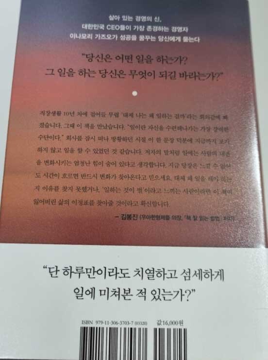 “몸은 회사에 있었지만 정신은 내 것이 아니었다. 나는 마치 이번 생이 끝장난 것처럼 아무런 꿈도 꾸지 않고 시체처럼 살았다.” 사투리가 들킬까 봐 사무실에 울리는 전화 벨소리마저 두려웠던 별 볼일 없던 청년 이나모리 가즈오는 어떻게 자신의 삶을 정면으로 응시하고 잠재력을 폭발시켜 일의 주인으로 거듭난 걸까? 그리고 무엇이 평범했던 그의 삶을 특별한 삶으로 변화시킨 걸까? 저자는 이 책에서 현재가 갑갑하고 미래가 막막한 한국의 일하는 모든 사람에게 이렇게 묻는다. “당신은 어떤 일을 하는가? 왜 그 일을 하는가? 그 일을 하는 당신은 무엇이 되길 바라는가?”