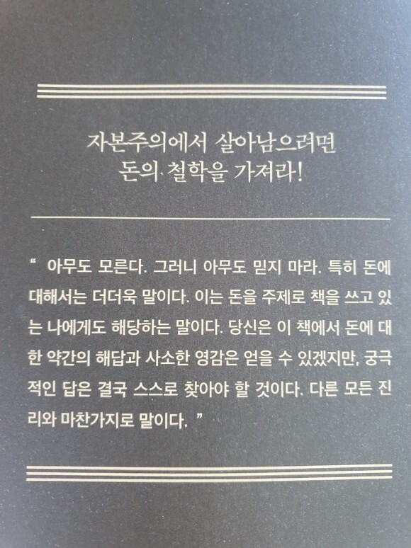 이 책을 천천히 읽어나가며 돈의 본질적인 속성을 이해하고 이에 대한 자신의 생각을 정립한다면, 평범한 사람과는 다른 부자의 그릇을 깨달을 수 있을 것이다.