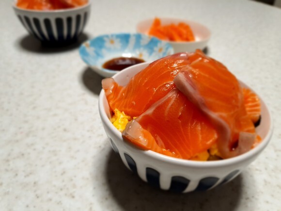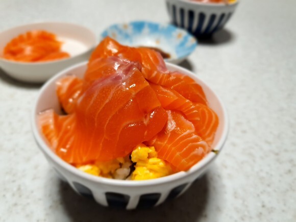 마트에서 사온 연어와 갓지은 밥에 밑간을하고