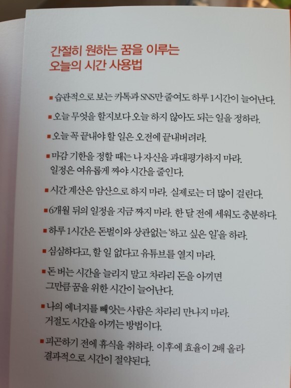 사실상 우리가 평소에 텔레비전을 보거나 인터넷, 유튜브를 하는 시간을 조금만 줄여도 몇 시간을 모을 수 있다. 잠깐 휴식을 취한다는 생각으로 스마트폰을 들여다보다 정신을 차리고 보면 어느새 1시간이 흘러 있다. 스마트폰을 들여다보고, 잡다하지만 해야 할 일들을 하고, 먹고 자고, 돈 버는 일을 하고 나면 시간이 없을 수밖에 없다. 이럴 때는 동시에 같이 해도 되는 일들을 모으고(예를 들어 유튜브를 보면서 운동하기), 틈틈이 흘러가는 시간을 붙잡아서 무언가를 해야 한다. 그 밖에 관계를 맺는 데서 오는 시간 낭비도 무시할 수 없다. 거절하지 못해서, 불평불만을 하느라, 지나간 것을 후회하느라, 무의미한 논쟁을 벌이느라 적지 않은 시간을 쓴다. 관계에서 오는 시간 낭비는 감정 소모로도 이어져 더 큰 영향을 미친다. 일상에 숨어 있는 시간들을 모아서 꿈을 이루는 시간으로 만들려면 생각을 바꿔야 한다.