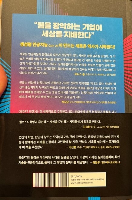 생성형 인공지능의 등장으로 어떤 산업이 새롭게 주목받고, 어떤 산업이 사라질 것인가. 마이크로소프트에 대항하는 구글, 애플, 테슬라는 지금 어떤 준비를 하고 있을까. 우리나라의 기업들은 세계의 움직임에 어떤 대응을 준비하고 있을까. 작게는 나의 직업부터 크게는 국가의 미래까지 이 책에 담고 있는 치열한 순간들을 통해 세계 경제와 인류의 미래가 어떻게 나아갈 것인지를 예측할 수 있다.