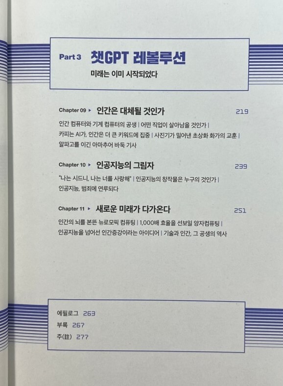 어쩌면 챗GPT는 시작에 불과할지 모른다. 더 고도로 발전된 기술이 등장할 때 우리는 다시 변화의 물결을 맞이하게 될 것이다. 현재 오픈AI를 필두로 새롭게 두각을 나타내는 많은 스타트업과 빅테크 기업들의 전쟁 속에서 우리가 해야 할 일은 기술과의 공생을 바탕으로 새로운 정보와 기술을 배우고 분석하는 것이 아닐까. 그 시작점에서 가장 빠른 소식을 담은 이 책이 많은 사람의 시야를 넓히고 확장하는 데 도움이 될 것이다.