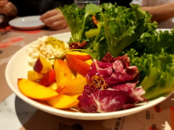 신선한 샐러드, 스파게티와 화덕에서 직접 구워낸 피자들