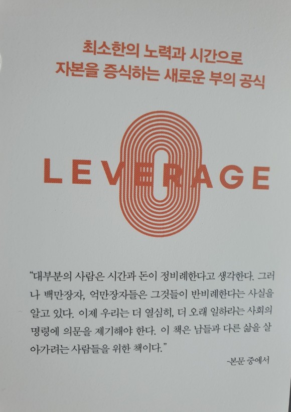 『레버리지』는 이러한 사회의 명령에 굴복하지 않고, 무지한 상태로 침묵하지 않고, 혁신적으로 생각하고, 최선의 결과를 내는 기술이다. 더 짧은 시간에 더 많은 일을 처리하고, 비즈니스를 위해 타인을 활용하는 방법이며, 끊임없이 열심히 일하는 희생의 규칙을 깨뜨리고, 관습에 의문을 제기하고, 중복과 시간 낭비를 배제하여 높은 수준의 성취를 얻는 새로운 부의 공식이다.