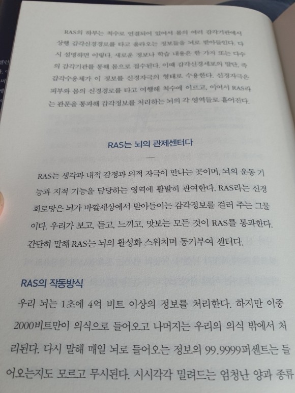다시 말해 우리의 뇌는 나의 신념 체계에 따라 내게 유리하게도 작용하고 불리하게도 작용할 수 있다. 돈을 벌려면 열심히 일하는 수밖에 없다고 믿는 사람은 그 믿음을 확인하고 강화하는 정보만을 보게 되고, 나아가 그 믿음을 사실로 증명하는 삶을 살게 된다. 뼈 빠지게 일하지 않고도 돈을 벌 수 있는 기회들을 망상활성계가 말끔히 치워주기 때문이다. 그 반대의 경우도 마찬가지다.