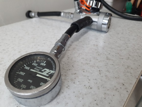 해외 다이빙을 가기전에 풀장연습때 발견한 싱글게이지에 버블이 보여서