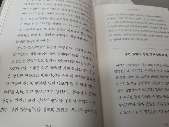 “인간은 정치적 행위를 통하지 않고는 행복을 성취할 수 없다. 자유롭고 동등한 시민은 지배하고 지배 받음으로써 정치적 행위를 수행하고, 지배하는 사람은 전체 공동체의 행복을 지향하기 때문에 정치가, 즉 입법가는 시민을 ‘좋은 시민’으로, 나아가 ‘좋은 인간’으로 만들어야만 한다. 정치적 동물로서 인간이 행복하기 위해서는 ‘좋은 시민’이어야 하고 ‘좋은 인간’이어야 한다.”(26쪽) “그가 이상적으로 바라보는 정치체제는 어떤 ‘정치체제’일까? 시민의 도덕성, 시민의 평등성, 시민 자신의 이익이 아닌 전체의 이익을 목적으로 한다는 점에서, 그것은 ‘시민에 의한, 시민을 위한, 시민의 총의에 따르는’ 정치체제가 아닐까?”