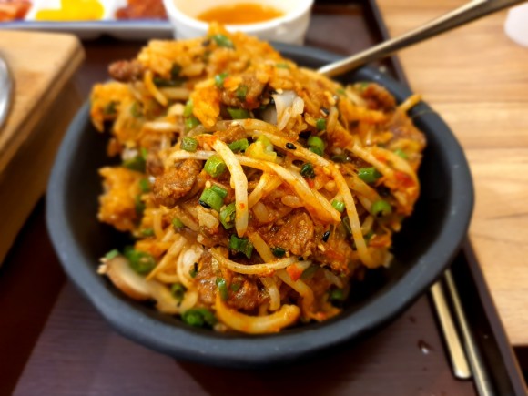 덮밥형식으로 솥에다가 밥으 올리고 위에 토핑처럼 수북하게