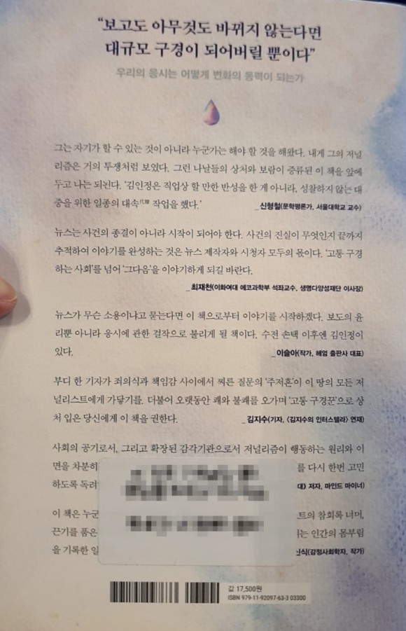 이 책을 읽은 김지수 기자는 “단죄하거나 단정하지 않는 저널리스트가 있는 사회는 희망이 있다”고 했다. 1장에서 고통을 소비하는 세태를 진단한 저자는, 2장에서는 사회가 납작하게 대상화하는 고통의 맥락을 복원한다. 3장에서는 나의 타임라인에서 소외된 낯선 고통의 모습을 발견하고, 마지막 4장에서는 모든 이야기를 변화로 꿰어낼 공적 애도의 자세를 제안한다. 공동체가 뉴스의 뒷이야기를 써 내려가도록 독려하는 이 구성은, 희망을 향해 나아가는 선연한 지도가 된다.