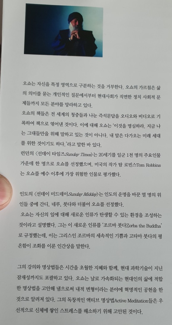 오쇼와 함께하는 3일간의 명상체험. 명상이란 육체적, 정신적으로 아무것도 하지 않고 있을 때, 즉 모든 행위가 멈추고 그저 존재하기만 하는 상태를 말한다. 우리는 명상을 행위로 할 수 있거나, 단련할 수 있는 것이 아니라, 그것을 이해할 수 있을 뿐이다. 홀로 존재할 수 있는 시간이 주어질 때마다 모든 행위를 멈추어라. 생각하는 것, 집중하는 것, 묵상하는 것 모두 행위이다. 단 한 순간이라도 아무것도 하지 않고, 자신의 중심에 위치하며, 온전히 이완될 때가 바로 명상이다. 그 방법을 깨우치기만 하면, 자신이 원하는 만큼 얼마든지 그 상태를 유지할 수 있다.