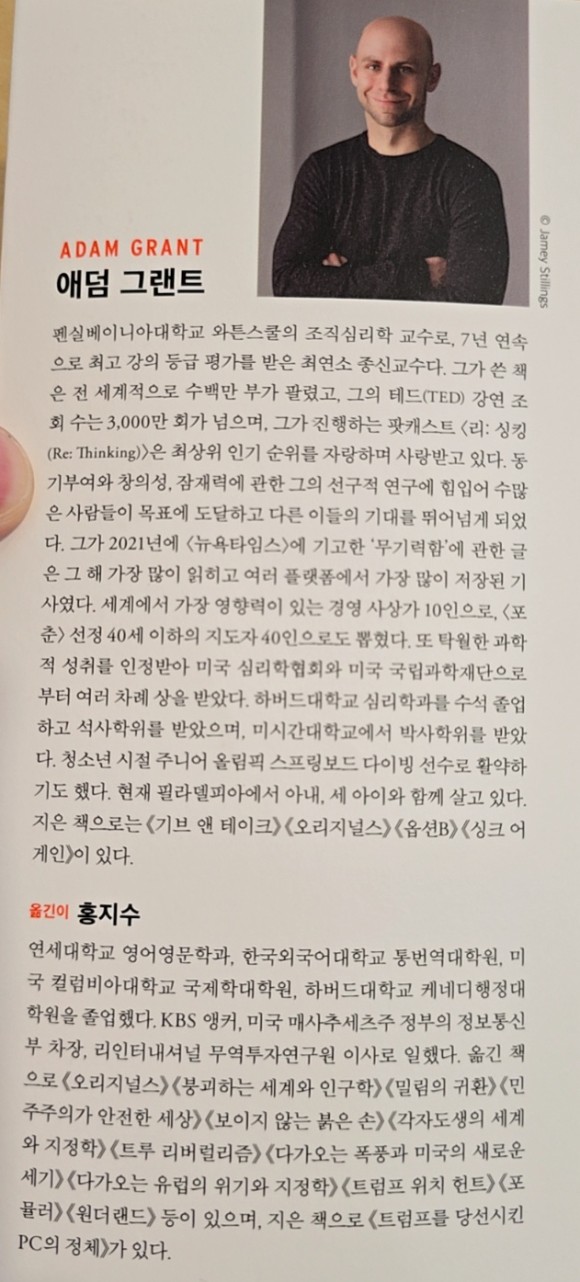 애덤 그랜트는 전 세계적으로 이름난 조직심리학자이자 세계 최고의 동기부여 전문가이자 사회과학자다. 그는 전작인 《오리지널스》를 통해 대세에 순응하지 않고 시류를 거스르며 구태의연한 전통을 거부하는 새로운 유형의 인재상을 제시했고, 《싱크 어게인》을 통해 지금까지 가지고 있던 모든 확신과 믿음을 다시 생각해보고 의심하는 것이 곧 진짜 지혜가 될 수 있음을 역설하는 등 매우 독창적인 메시지들을 전해왔다. 그리고 3년 만에, 많은 이들의 성장과 발전을 촉진시키는 숨은 원동력 ‘잠재력’에 관한 이야기로 다시 돌아왔다. 그는 이 책에서 남달라 보이는 재능이나 자질은 타고나는 게 아니라 길러지는 것이며, 특별한 사람만이 아니라 누구나 자신 안에 숨은 잠재력을 발굴하고 키워 목표한 바를 이룰 수 있음을 매우 실용적인 전략과 현실적인 조언으로 알려준다.