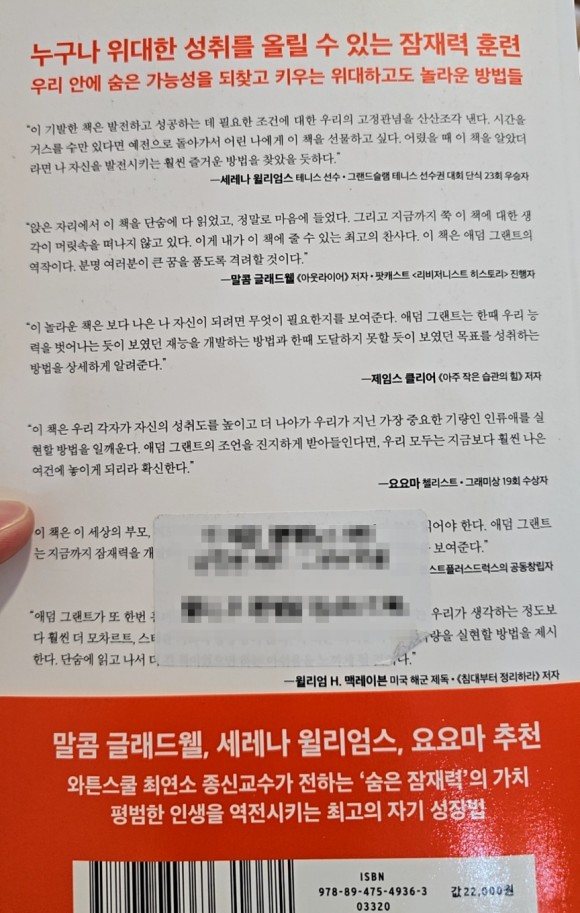 타고난 재능은 기회와 환경, 동기부여의 차이에서 비롯된 결과일 뿐, 누구나 자신 안에 ‘숨은 잠재력’을 발휘하여 더 높이, 더 멀리 날 수 있다! 심리학은 물론 경제경영, 자계계발 분야를 넘나드는 탁월한 주제 선정과 우리 삶에 도움이 되는 행동 지침과 선한 영향력까지… 출간하는 책마다 센세이셔널한 반향을 불러일으키며 세계적인 베스트셀러로 자리매김한 《기브 앤 테이크》, 《오리지널스》, 《싱크 어게인》의 저자이자 와튼스쿨 조직심리학과 최연소 종신교수인 애덤 그랜트가 우리 자신과 다른 사람들을 예상치 못한 수준으로까지 끌어올릴 수 있는 방법에 대한 이야기를 담은 《히든 포텐셜》을 펴냈다.