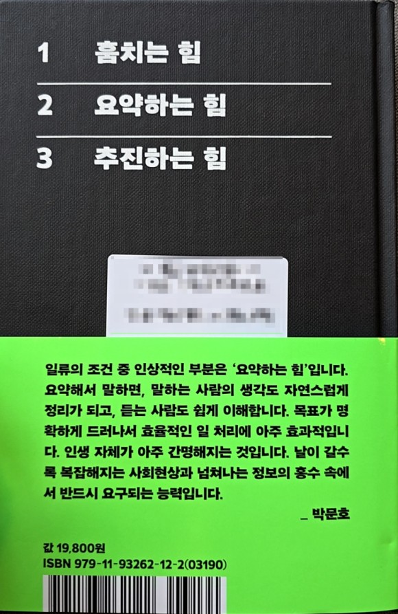 두 번째 ‘요약하는 힘’은 세 가지 조건 중 가장 중요한 조건으로 언급하고 있는데, 요약이야말로 생활 전반에 있어 중요도와 우선순위를 파악하는 데 중요한 기술임을 강조한다. 요약을 잘하면 핵심 주제와 목표를 명확하게 파악할 수 있고, 나아가 필요 없는 것들은 과감히 버림으로써 삶 자체가 간명해진다. 말도 습관도 장황하게 늘어놓지 말고 요약하는 습관을 들여야 한다. 이 책을 추천한 박문호 박사도 “요약하는 말버릇을 기르면 시간 확보는 물론이고 업의 발전에 큰 도움이 될 것”이라고 말했다.
