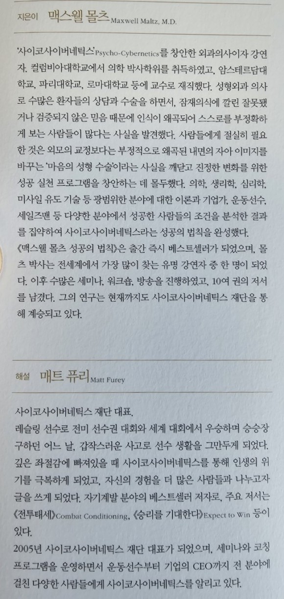 1960년 출간된 이후 3,000만 부 이상 팔린 최고의 자기계발서 《맥스웰 몰츠 성공의 법칙》의 55주년 최신 개정증보판. 반세기가 넘게 독자들의 꾸준한 사랑을 받아온 이 책은 이후에 출간된 거의 모든 자기계발서의 원전이라고 평가받는다.