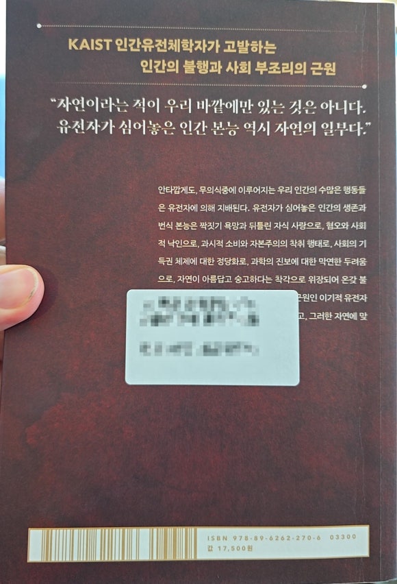 리처드 도킨스의 『이기적 유전자』가 출간된 지 거의 50년이 흘렀고, 남녀의 사랑을 파헤친 『욕망의 진화』가 출간된 지도 무려 30년이 지났다. 그러나 그동안 진화나 유전자의 관점에서 가정, 정치, 경제, 사회, 문화 전반에 대해 소개하는 책은 사실상 없었다. KAIST 바이오및뇌공학과 교수이자 인간유전체학자인 저자는 이에 대한 문제의식을 가지고, 《네이처》, 《사이언스》, 《셀》 등 유수 학술지들에 실린 최신 연구들을 바탕으로 오늘날의 불평등한 경제, 혐오 정치, 착취 사회, 능력주의 문화를 해부한다. 구체적으로, 유전자가 심어놓은 인간의 생존 본능과 번식 본능이 어떻게 왜곡된 짝짓기 욕망과 뒤틀린 자식 사랑으로, 혐오와 사회적 낙인으로, 과시적 소비와 착취 행태로, 기득권 체제에 대한 정당화로, 과학의 진보에 대한 막연한 두려움으로, 자연이 아름답고 숭고하다는 착각 등으로 위장되어 온갖 불행과 사회 부조리를 초래하는지를 고발한다. 더 나아가, 인간이 이기적 유전자들을 무의식적으로 따르는 데서 발생하는 이러한 갖가지 비극으로부터 우리가 벗어날 수 있는 길을 모색한다.