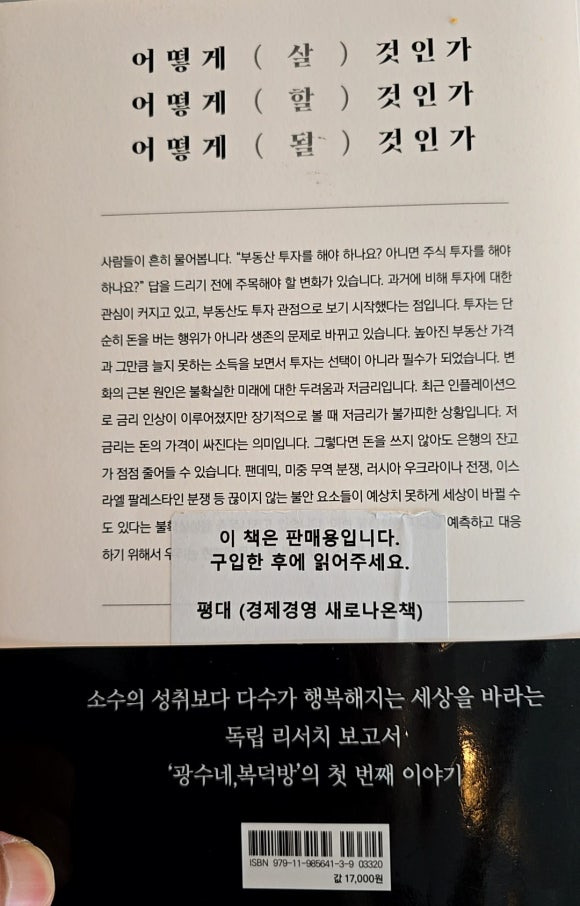 모두가 내 집을 마련하고 싶고, 큰맘 먹고 투자한 주식에서 성과를 내고 싶어 한다. 뉴스에서나 보던 ‘파이어족’이 어쩌면 내 이야기가 될지도 모른다고 남몰래 희망을 품는다. 하지만 사고 싶은 집은 너무 비싸고, 주가는 연신 마이너스다. 물가는 떨어지지 않고 계속해서 오르는데 소득은 몇 년째 제자리에서 오를 기미가 보이지 않는다. 경제 공부는 할 만큼 했다고 생각하는데 왜 아직도 나는 이렇게 힘들기만 할까? 독립 리서치 회사 ‘광수네,복덕방’을 운영하며 대한민국 경제를 전망하고 투자 리서치를 해 오고 있는 저자는 희망보다 절망을 느끼는 독자들에게 ‘좋은 질문’을 통해 다시 희망을 찾자고 제안한다. ‘어디’에 있는 집을 사야 하는지, ‘무슨’ 주식에 투자해야 하는지 질문할 것이 아니라, ‘어떻게’ 살 것인지, 즉 방법에 대해서 질문해야 한다고 말한다. 방법을 제대로 모르고 목적만을 추구하며 달리다 보면 목적에 도달하기도 전에 방향을 잃고 쓰러지고 말 것이라고 조언한다.