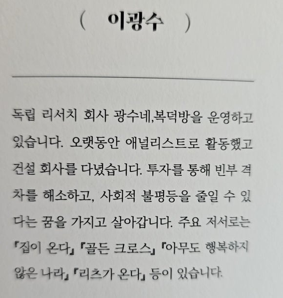 부동산 가격이 폭등하면서 ‘벼락거지’라는 신조어가 생겨났다. 그러다 집값이 하락하자 무리하게 빚을 얻어 내 집 마련을 한 사람들을 ‘영끌족’이라며 조롱한다. ‘벼락거지’이고 ‘영끌족’이라고 해서 그들을 실패했다고 말할 수 있을까? 불확실한 시대를 살면서 우리는 경험을 했고, 어려움을 겪으며 좀 더 근본적인 본질과 마주했다. 그렇다면 이제 어려움을 딛고 다시 일어설 차례다. 내면의 소리를 듣고, 한 걸음 더 가까이 다가간 본질에 대해 고민해야 한다. 저자는 개인의 성취보다 다수가 행복해지는 세상이 가능하다고 믿는다. 오직 그것만이 답이라고 믿는다. 그렇기 때문에 내 집을 마련하고, 투자에 성공하고, 더불어 다른 사람들과 행복하게 살아갈 수 있는 미래를 위해 오늘도 경제를 전망하고 투자 리포트를 만든다.