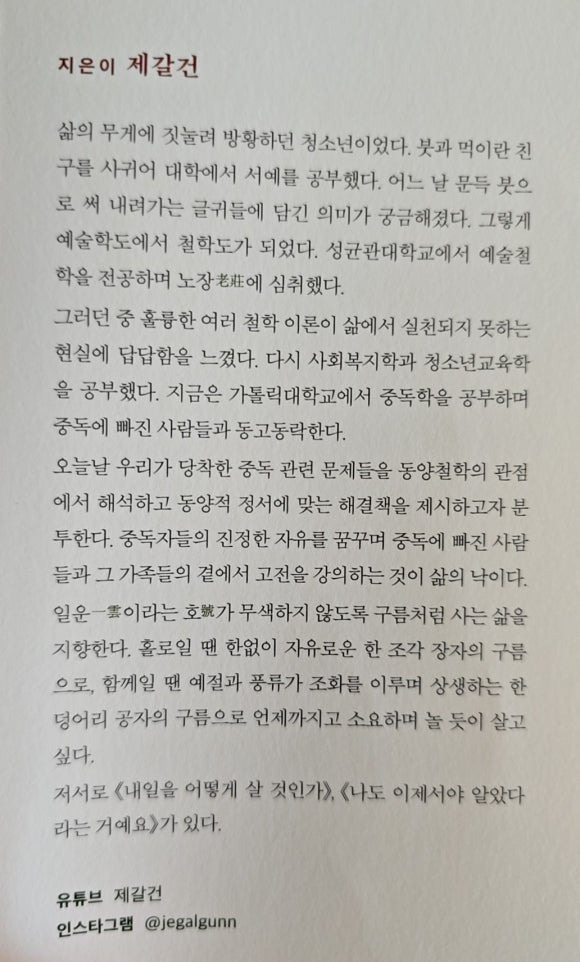 이 책의 저자는 철학을 만나기 전까지 싸움과 알코올 중독에 사로잡혀 방황하는 시기를 겪었다. 이후 신부가 되고 싶어 7년간 교구 두 곳과 수도회 두 곳에 지원했지만 몸에 큰 문신이 있다는 이유로 불합격했고, 필리핀 수도회에 갈 기회를 얻었으나 코로나19 사태로 출국이 무산되는 바람에 신부의 꿈은 좌절되었다. 그는 당시를 회상하며 ‘하늘이 나를 버렸다는 말이 저절로 이해되는 순간이었다’고 말한다. 그랬던 그가 현재는 사랑하는 아내를 만나 아들을 낳고 가정을 꾸리게 되었다. 서예와 동양철학으로 마음을 수련했고 자신처럼 방황하는 이들을 위하여 청소년교육학과 사회복지학을 전공했으며 현재는 중독학 박사 과정을 밟고 있다. 사고뭉치 문제아에서 박사 과정생으로, 신부 지망생에서 누군가의 남편이자 아빠가 된 것이다.