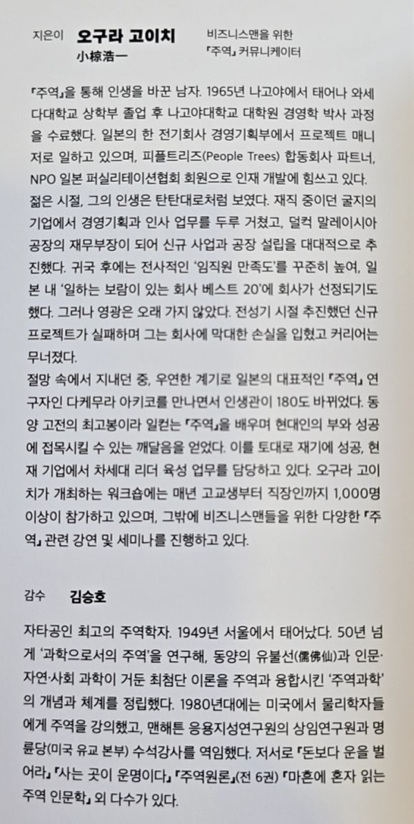 『주역』은 기원전 중국의 제왕들이 재력과 권력을 총동원해 모든 부와 운(運)의 질서를 압축한 경전이다. 그래서 공자부터 이순신, 이나모리 가즈오에 이르기까지 시대와 국적을 막론하고 수많은 시대의 거인들이 3,000년 넘게 동양 최고의 경전이자 삶의 전략서로 삼았다. 일본의 『주역』 커뮤니케이터이자 리더십 코치로 활동하는 저자 오구라 고이치는 탄탄대로였던 인생이 처참하게 무너진 순간 『주역』을 만났다. 『주역』 64괘의 의미와 가르침을 깨닫고 삶에 직접 적용하자 평범한 직장인에 불과했던 그의 인생관은 송두리째 뒤바뀌었다. 이 과정에서 『주역』이 전하는 진리를 현대인의 부와 성공에 접목하는 통찰을 얻었고, 이를 효과적으로 활용하는 심리·철학·경영 이론을 총망라해 신간 『거인들은 주역에서 답을 찾는다』에 집약했다.