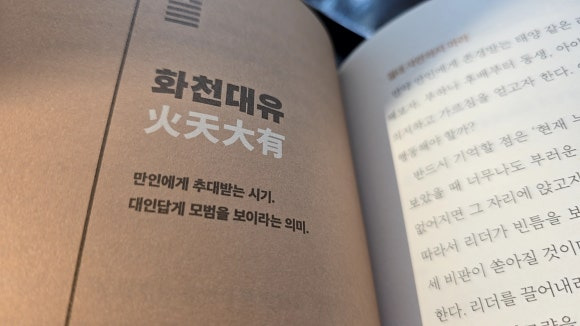먼저 무한히 펼쳐지는 성장과 나를 위해 남을 살피는 현묘한 인간관계의 해법이다. 이 책에는 『주역』의 마지막 괘에 해당하는 ‘화수미제(火水未濟)’가 가장 먼저 등장한다. “일이 완성에 가까워지면 새롭게 펼쳐질 미래에 대비하라”라는 메시지에 ‘경험-반성(내성)-학습’의 무한 발전을 의미하는 경험학습 사이클을 덧붙여, 미숙하다는 것은 앞으로 나아갈 수 있다는 것이라는 희망을 전한다. 성장은 주변을 둘러볼 때 날개를 단다. 새로운 조직에선 과거의 경험과 지식을 잊고 힘든 순간엔 은인의 존재와 감사의 마음을 가지라 말한다. 우리는 이렇듯 내면을 다스리며 자신만의 대의(大義)를 세움으로써 진정한 리더의 길로 들어설 수 있다.