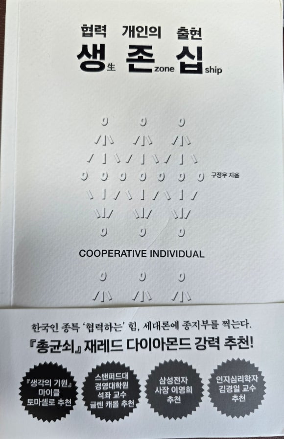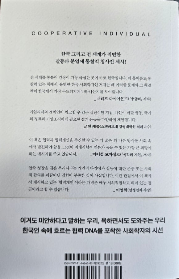 도로에 쏟아진 맥주병을 보면 같이 치워주려고 한다, 처음 만나는 사람에게도 때가 되면 ‘밥 먹었냐 ’고 물어본다, 엘리베이터를 타면 중앙이 아닌 모서리에 선다, 다른 사람이 노래를 부르면 박수라도 같이 쳐준다, 대화를 못 알아들어도 일단 알아들은 척 한다, 치열하게 싸워서 이기고도 미안하다며 상대의 등을 어루만져 준다. 한번쯤 이런 경험이 있다면 ‘찐한국인’. 한국인에게는 태생적으로 ‘협력’이라는 DNA가 내재되어 있다. 초고도로 발달한 과학기술 덕분에 ‘혼자’ 살아가는 데 불편함이 없다고 해도, 인간은 사회적 존재인 이상 결국은 함께 살아갈 수밖에 없다. 협력개인은 핵개인화되어 가는 시대에 유일한 대안으로 끄집어낼 수 있는 한국인 종특이다.