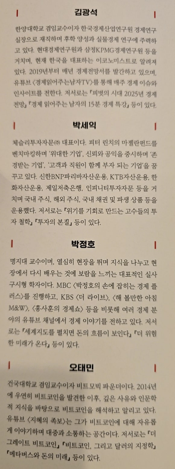 4부는 트럼프 2.0 시대의 산업과 주식시장을 전망한다. 대선이 있는 해의 주식시장, 향후 경기전망, 주목할 섹터와 종목 등 주식투자와 자산운용에 유용한 흥미로운 정보를 담았다. 오랫동안 국내외 주식과 채권, 파생상품을 운용하면서 시장을 분석해왔고 《투자의 본질》 등 다수의 저서를 펴낸 박세익 체슬리투자자문(주) 대표가 발제했다.