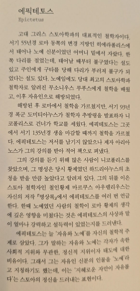 에픽테토스는 고대 그리스의 스토아 철학자이다. 그는 태어날 때부터 노예였으며, 한쪽 다리가 불편한 불구의 몸이었다. 그러나 자신만의 철학을 갈고닦아 니코폴리스에 철학 학교를 세우고 가르침을 전하며 수많은 이들의 스승이 되어 존경을 받았다. 황제조차 그에게 가르침을 청할 정도였다.